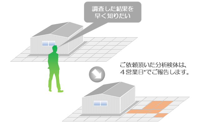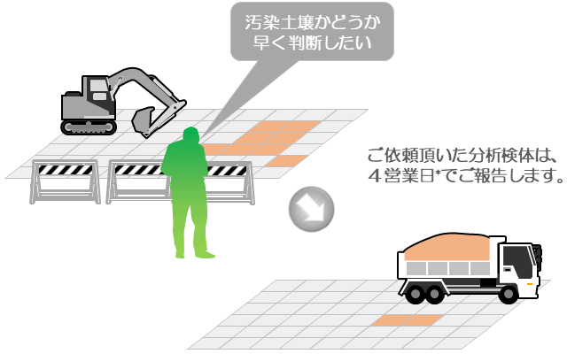 土壌汚染の有無、対策費用の把握に必要となる調査期間を大幅に短縮することが可能です。最速で、月曜日に採取し、木曜日に結果の速報を入手し、金曜日にお打合せも可能となります。